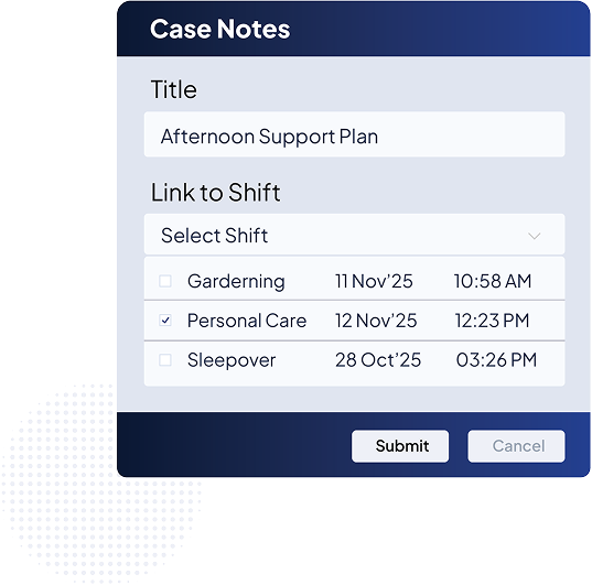 Every case note can be connected to a specific shift, creating a clear record of activities and support provided. This helps admins track exactly what happened during each service.